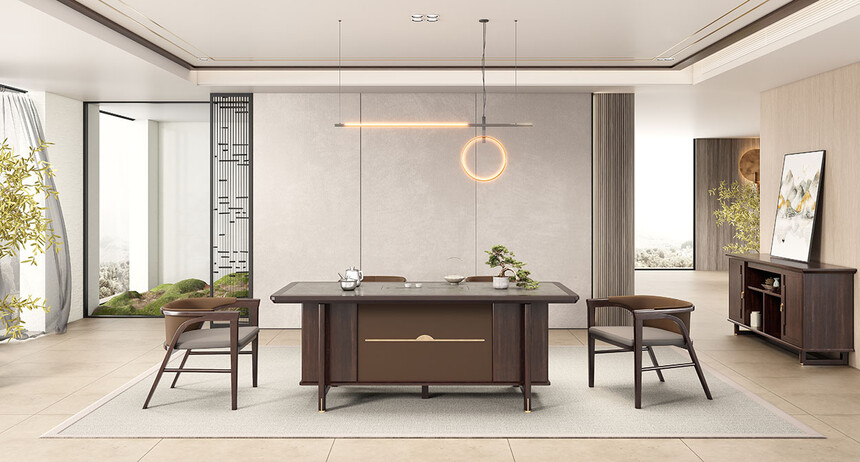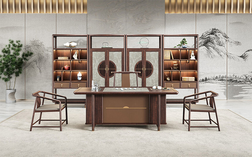 鸿泰系列在造型上主要采用硬朗简洁的直线条,温润的乌金木与质朴的岩板相结合,刚柔并济,时尚大方,既使得中式家具古典、质朴的内涵显现,又符合现代办公追求的时尚感、实用性。